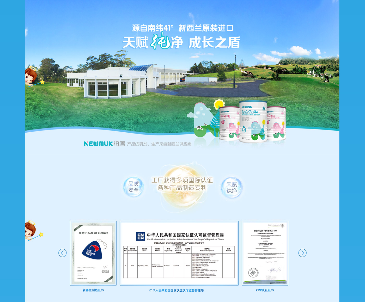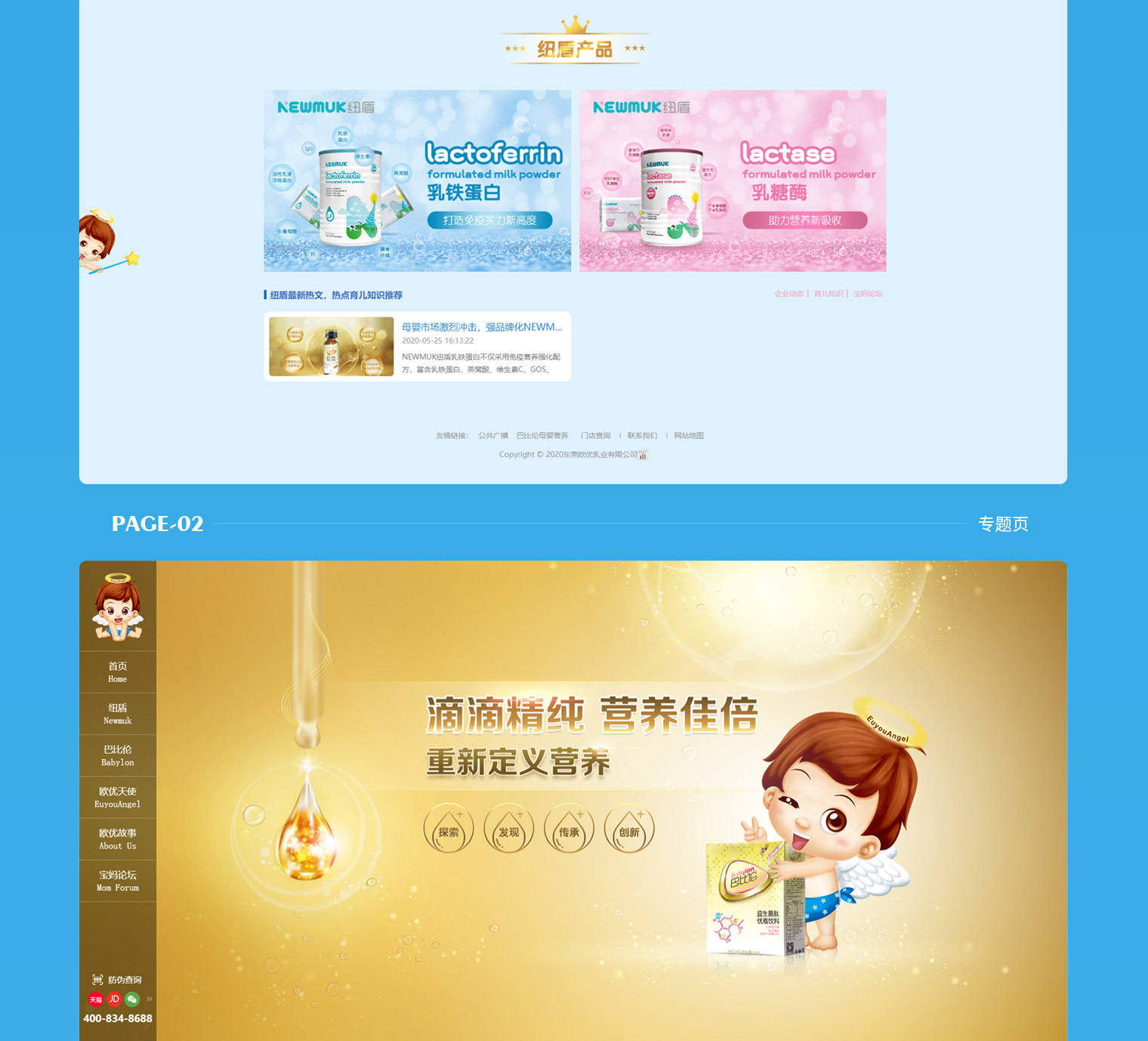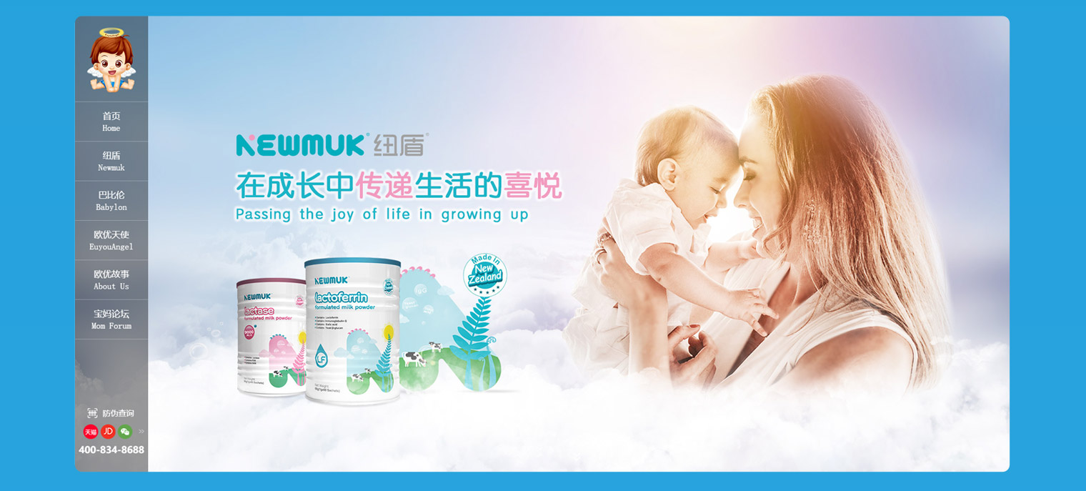 欧优乳业多品牌网站建设,网站主要以品牌传递为主,让用户群体进入网站第一眼提升对欧优乳业的品牌认识,通过网站同时展示旗下3大品牌“纽盾”“巴比伦”“欧优天使”,对每个品牌进行独立介绍及展示,每个品牌根据产品类型不同进行独立的UI风格设计,整站采用响应式H5制作,自适应电脑、手机、平台,同时具备门店检查及宝妈交流功能。