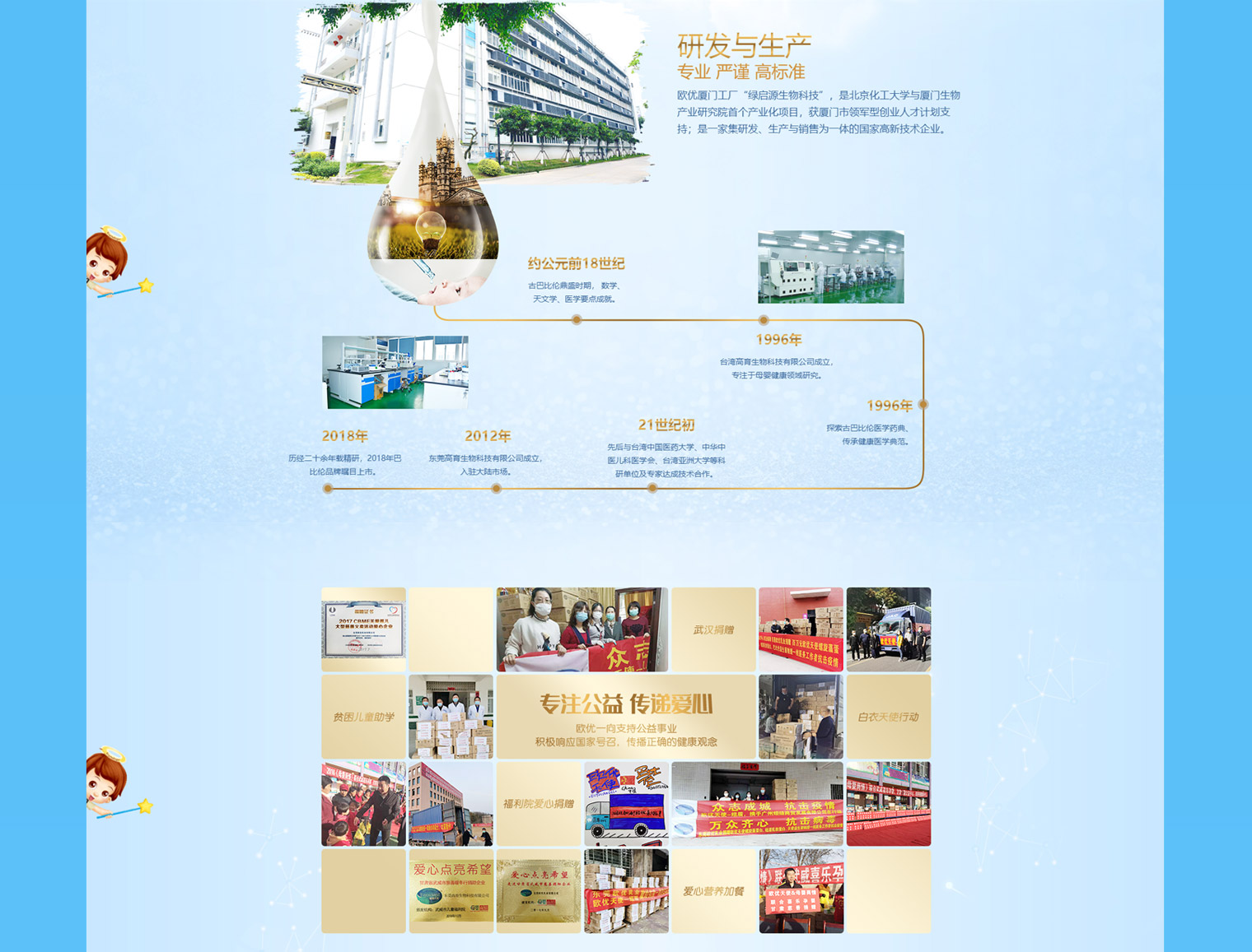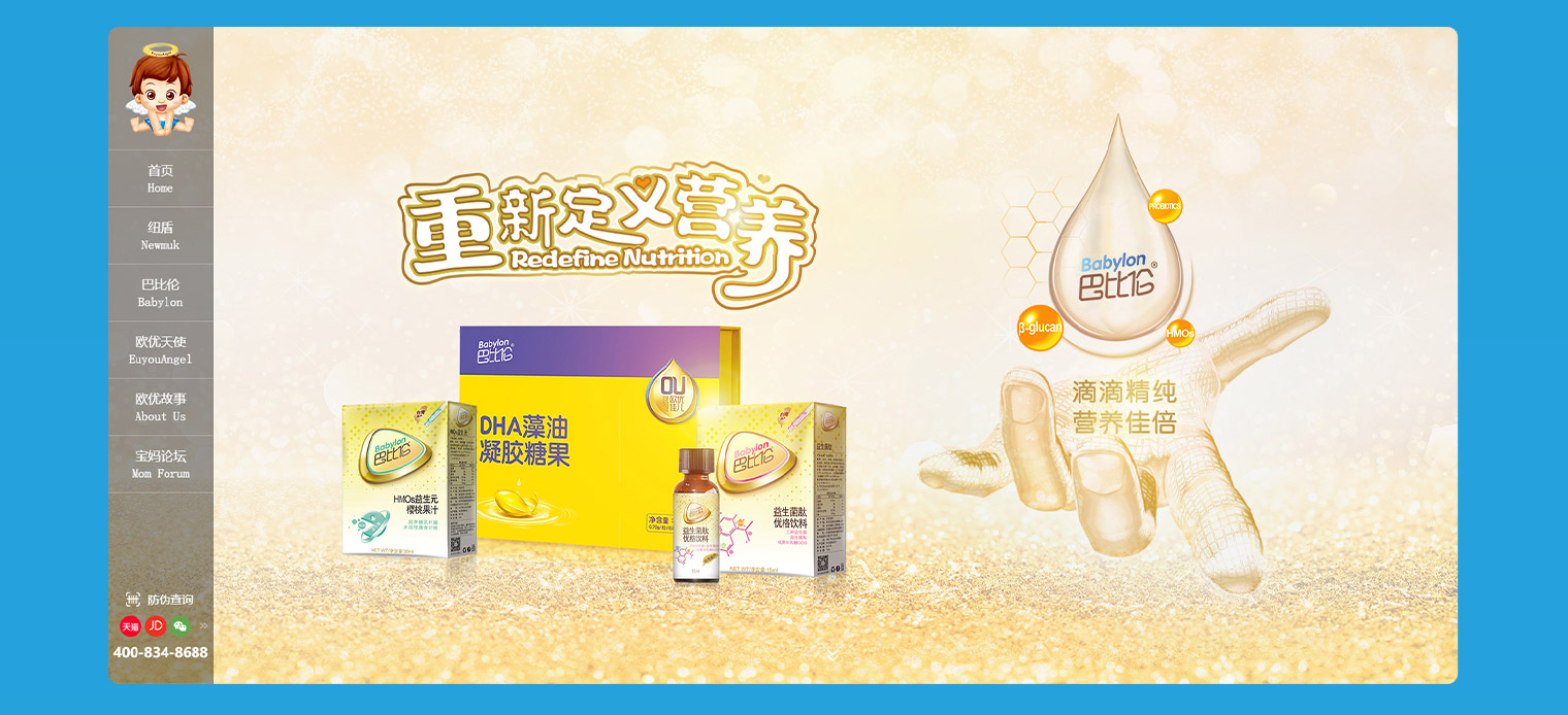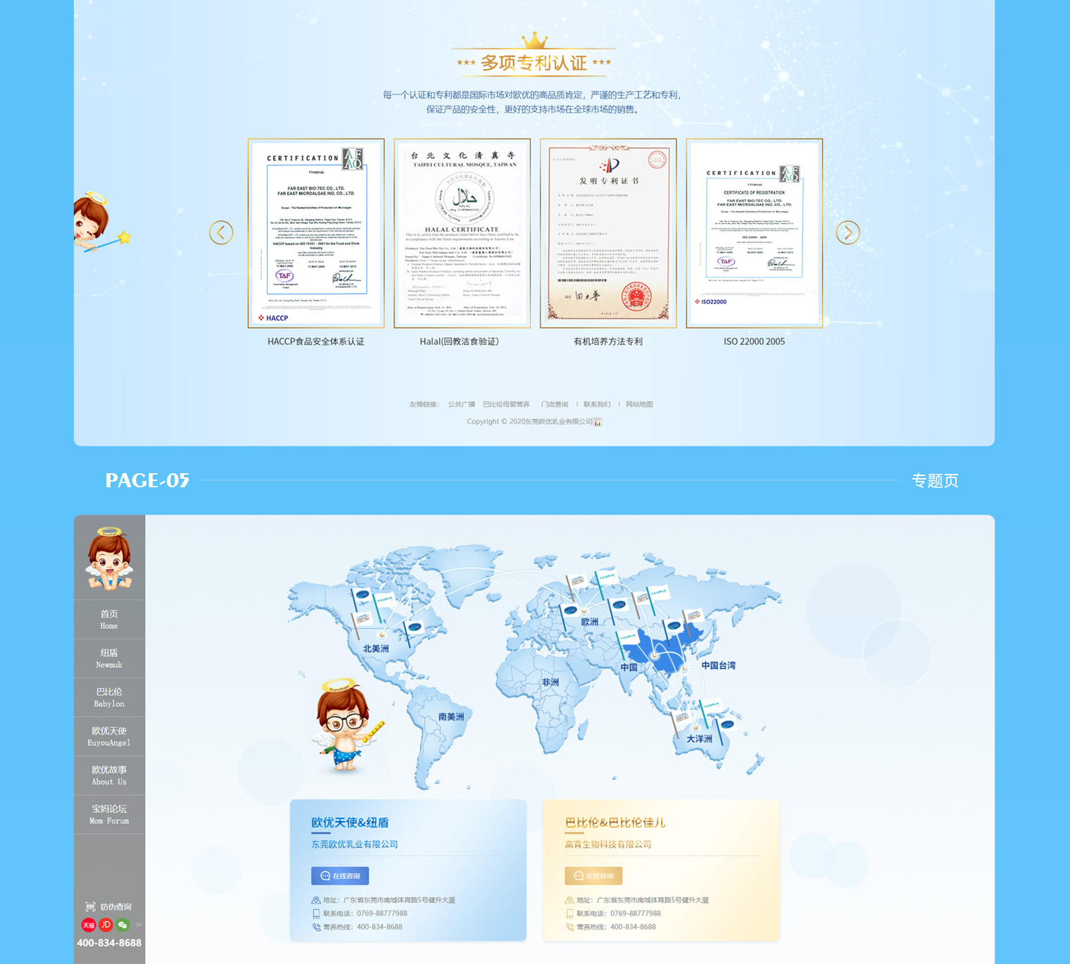 欧优乳业多品牌网站建设,网站主要以品牌传递为主,让用户群体进入网站第一眼提升对欧优乳业的品牌认识,通过网站同时展示旗下3大品牌“纽盾”“巴比伦”“欧优天使”,对每个品牌进行独立介绍及展示,每个品牌根据产品类型不同进行独立的UI风格设计,整站采用响应式H5制作,自适应电脑、手机、平台,同时具备门店检查及宝妈交流功能。